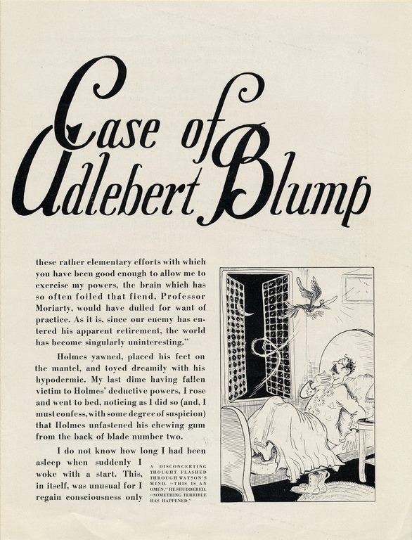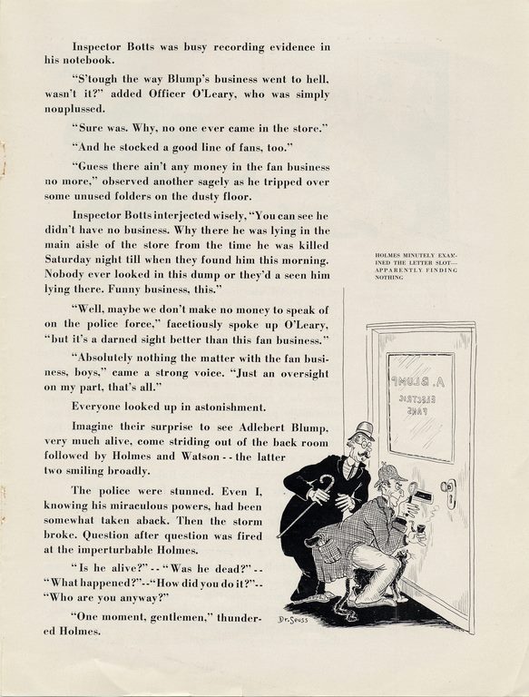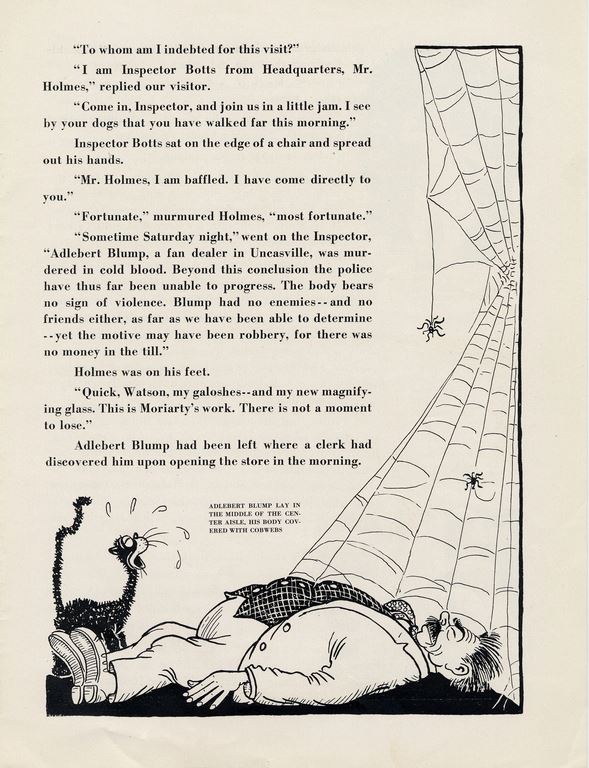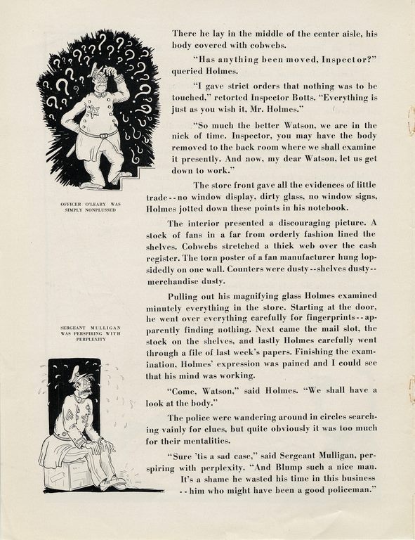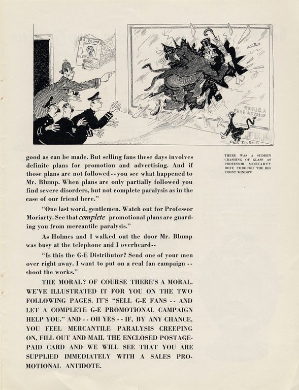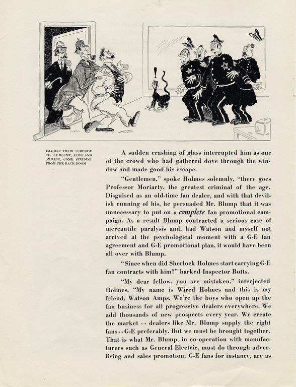 The piece follows GE marketers named “Wired Holmes” and “Watson Amps” as they set about trying to uncover who killed the titular fan dealer. Lo, it turns out Mr. Blump is still alive but suffering from “mercantile paralysis” because Holmes’ nemesis Professor Moriarty has convinced him that he doesn’t need to put on a “complete fan promotional campaign.”